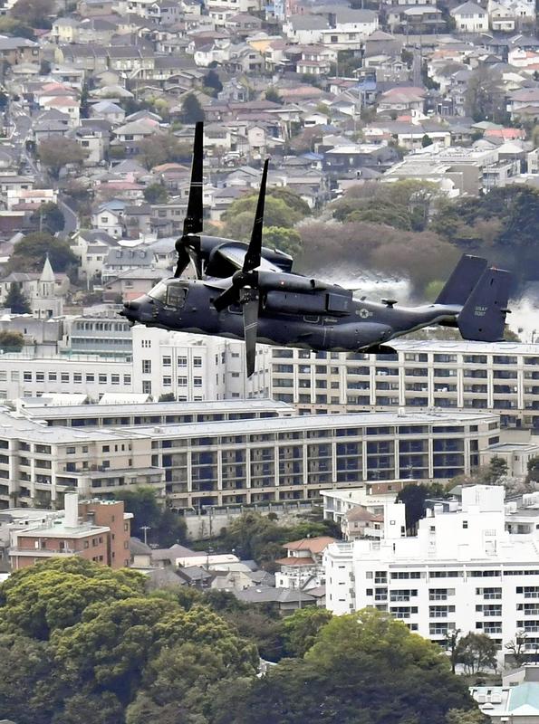 At 11:30 a.m. Thursday, five gray CV-22 Opsreys flew in formation over the Yokota base, which lies amid residential areas and farmland in Tokyo's Tama area. The aircraft, which had flown over from the U.S. military's Yokohama North Dock facility in Yokohama, slowly landed in succession on the runway in helicopter mode, with their propellers facing up.