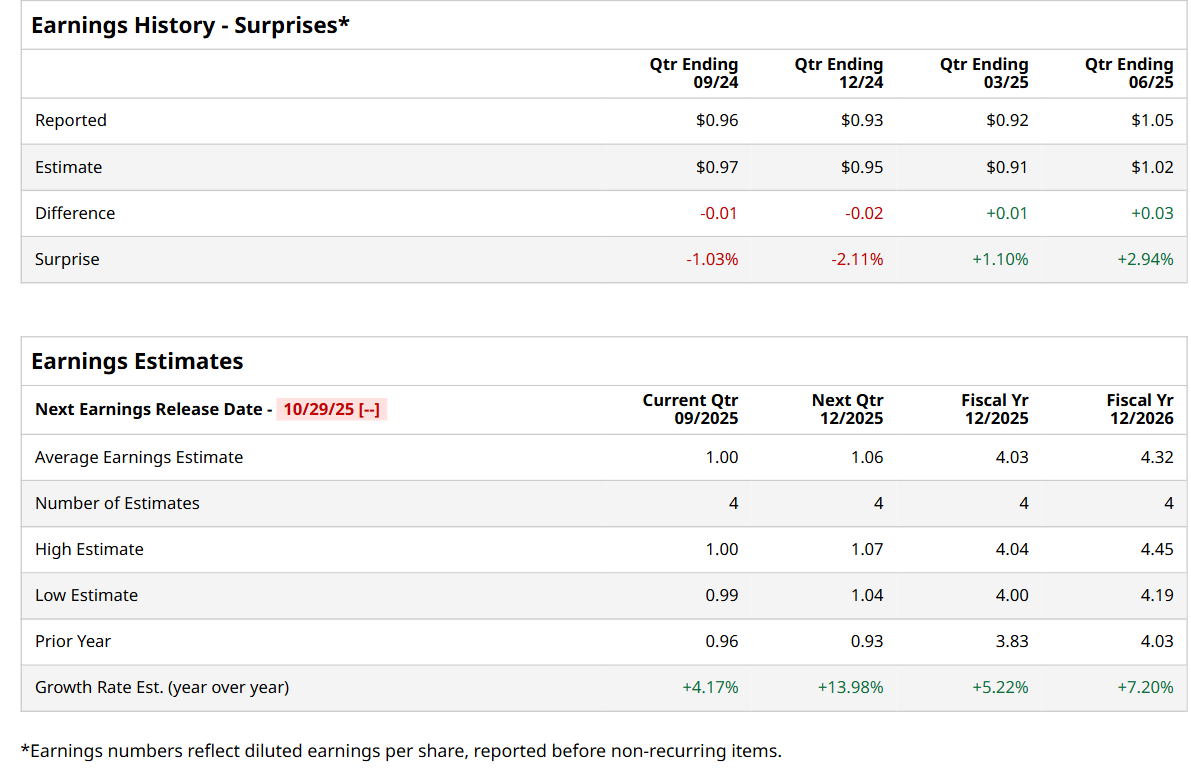Farmington, Connecticut-based Otis Worldwide Corporation (OTIS) develops, manufactures, installs, and services vertical transportation systems, primarily elevators, escalators, and moving walkways. Valued at a market cap of $35.8 billion, the company is expected to announce its fiscal Q3 earnings for 2025 before the market opens on Wednesday, Oct. 29.