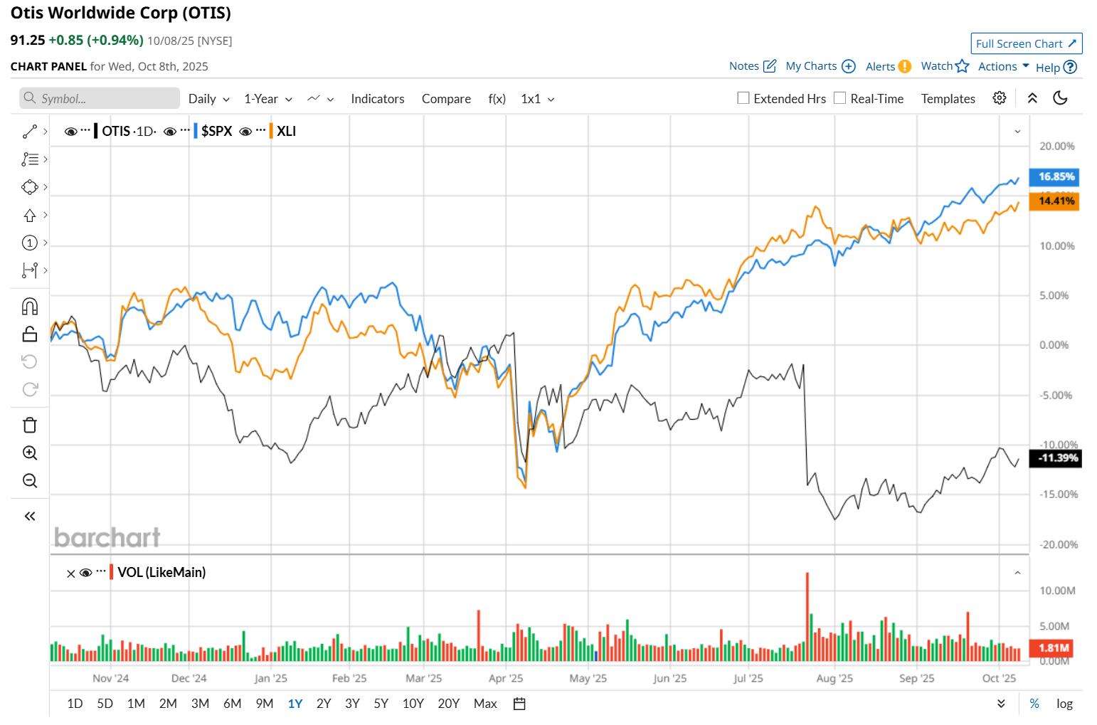 Shares of OTIS have declined 9.8% over the past 52 weeks, trailing behind both the S&P 500 Index's ($SPX) 17.4% rise and the Industrial Select Sector SPDR Fund’s (XLI) 14.8% uptick over the same time frame.