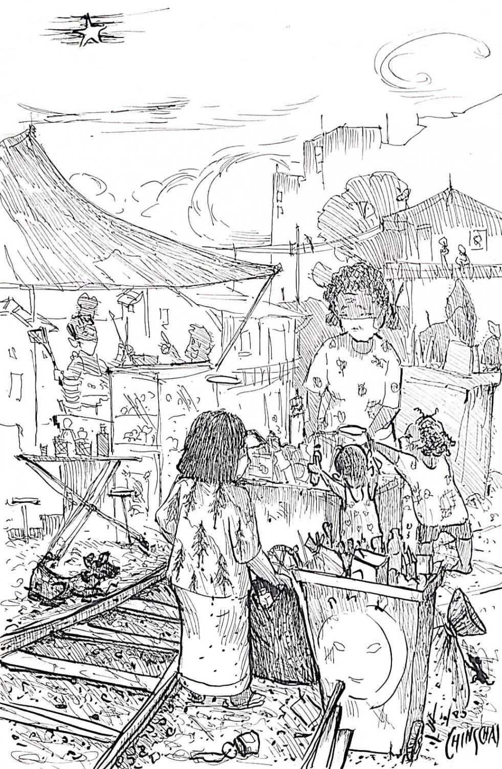 And now, today. Me and Granny and Scrawny Dog, we get up each morning at dawn when that rooster starts crowing -- waking everybody up. We collect plastic bottles, tin cans and paper together to sell for money to buy breakfast. And it's the best breakfast in the world, and the noodle shop lady always she still remembers when I was born on the street, next to her cart. And Granny held me and didn't let me fall to the ground, and they picked up Mommy and laid her in the back of that pickup and kidnapped her away. The noodle lady, she always gives us… well, not an extra portion, that would be too much, but she does add in "a little bit extra", because she says I am a growing girl. And some nice left overs they didn't throw in the garbage for Scrawny Dog.
