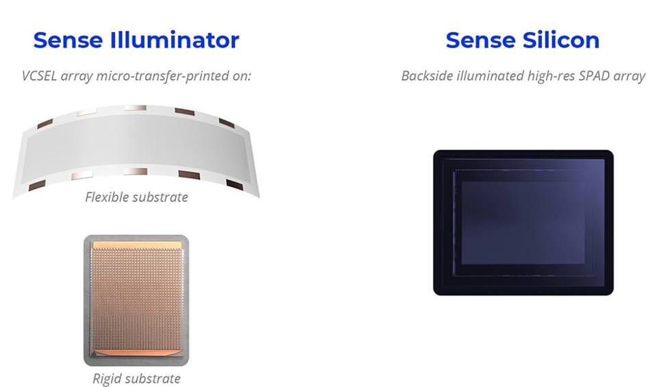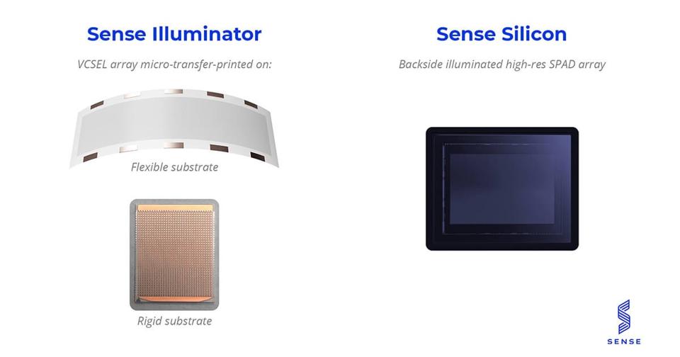 While Ouster has several mechanically rotating LiDARs (step and flash) available as products serving diverse markets (across a base of 400 customers) today, Sense has focused on the automotive space using a flash LiDAR approach in which arrays of VCSELs and SPADs are used to create 3D LiDAR images that are critical for ADAS and autonomous vehicles (AVs). Figure 2 shows the components of the LiDAR system, the key being the Sense Illuminator, which uses a patented micro-transfer printing process to transfer VCSEL elements from a rigid GaAs wafer to a flexible substrate, enabling graceful integration into car platforms and flash LiDAR operation without moving parts. SPAD arrays are used for detection.