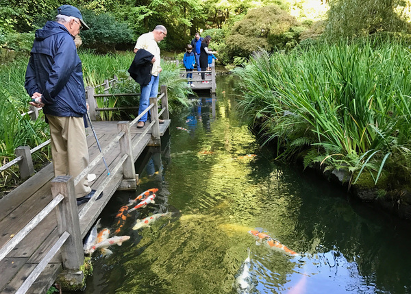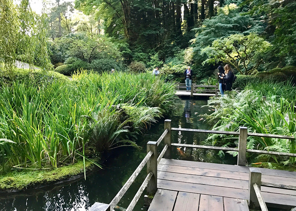 A flowing stream connects the park's Strolling Pond Garden, one of more than half a dozen set within this acreage. We catch glimpses of green lushness from the curved Moon Bridge, which bows across the upper pond. Plump koi dart beneath the Zig-Zag Bridge that traverses the lower pond. Irises fringe the walkways. Japanese maples cast crimson leaves on the breeze. And Heavenly Falls tumbles and splashes down a rocky expanse, almost too beautiful for words.