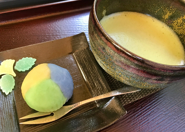 Green matcha tea is served with seasonal shibori at this glass-walled teahouse.