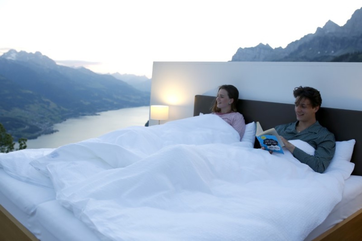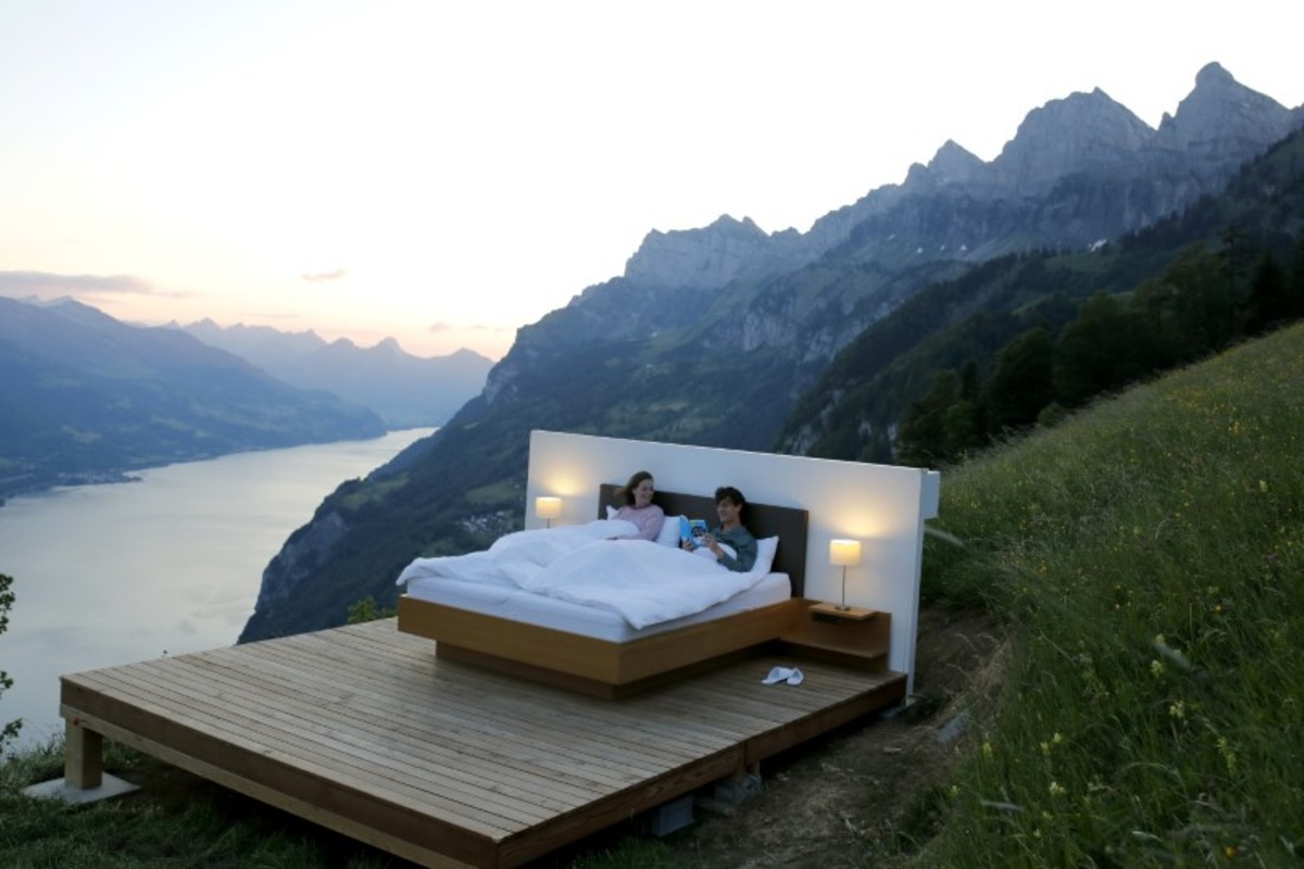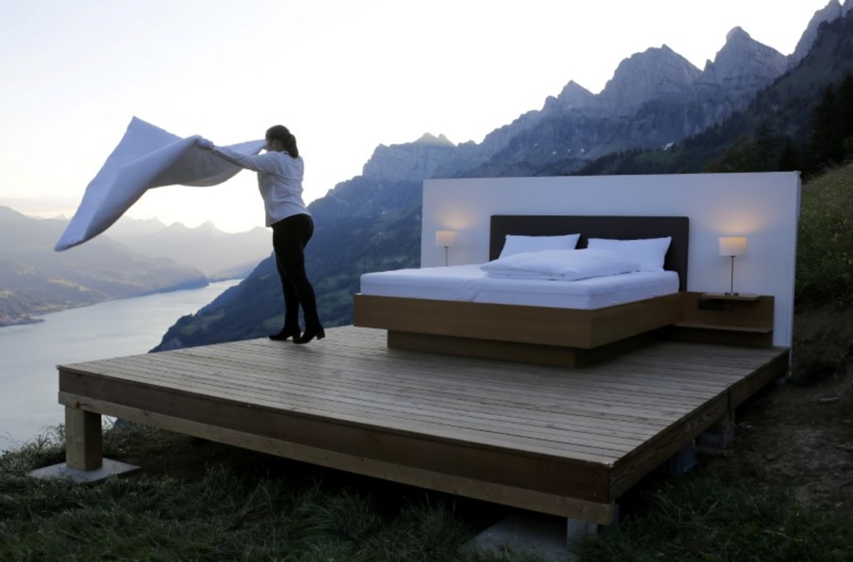 Dominic Gregorin and Anja Wachter (L) pose in the bedroom of the Zero-Real-Estate land art installation by Swiss artists Frank and Patrik Riklin, as the outbreak of the coronavirus disease (COVID-19) continues, on an alp in front of the Churfirsten mountain range and Lake Walen near Walenstadt, Switzerland May 29, 2020. REUTERS/Arnd WiegmannButler Larissa Ramer is seen behind as Dominic Gregorin and Anja Wachter (L) pose in the bedroom of the Zero-Real-Estate land art installation by Swiss artists Frank and Patrik Riklin, as the outbreak of the coronavirus disease (COVID-19) continues, on an alp in front of the Churfirsten mountain range and Lake Walen near Walenstadt, Switzerland May 29, 2020. REUTERS/Arnd WiegmannButler Larissa Ramer shakes out a duvet in the bedroom of the Zero-Real-Estate land art installation by Swiss artists Frank and Patrik Riklin, as the outbreak of the coronavirus disease (COVID-19) continues, on an alp in front of the Churfirsten mountain range and Lake Walen near Walenstadt, Switzerland May 29, 2020. REUTERS/Arnd WiegmannButler Larissa Ramer shakes out a duvet in the bedroom of the Zero-Real-Estate land art installation by Swiss artists Frank and Patrik Riklin, as the outbreak of the coronavirus disease (COVID-19) continues, on an alp in front of the Churfirsten mountain range and Lake Walen near Walenstadt, Switzerland May 29, 2020. Picture taken May 29, 2020. REUTERS/Arnd WiegmannDominic Gregorin and Anja Wachter (L) pose in the bedroom of the Zero-Real-Estate land art installation by Swiss artists Frank and Patrik Riklin, as the outbreak of the coronavirus disease (COVID-19) continues, on an alp in front of the Churfirsten mountain range and Lake Walen near Walenstadt, Switzerland May 29, 2020. 2020. Picture taken May 29, 2020. REUTERS/Arnd WiegmannDominic Gregorin and Anja Wachterin (L) pose in of the Zero-Real-Estate land art installation by Swiss artists Frank and Patrik Riklin, as the outbreak of the coronavirus disease (COVID-19) continues, on an alp in front of the Churfirsten mountain range and Lake Walen near Walenstadt, Switzerland May 29, 2020. REUTERS/Arnd Wiegmann