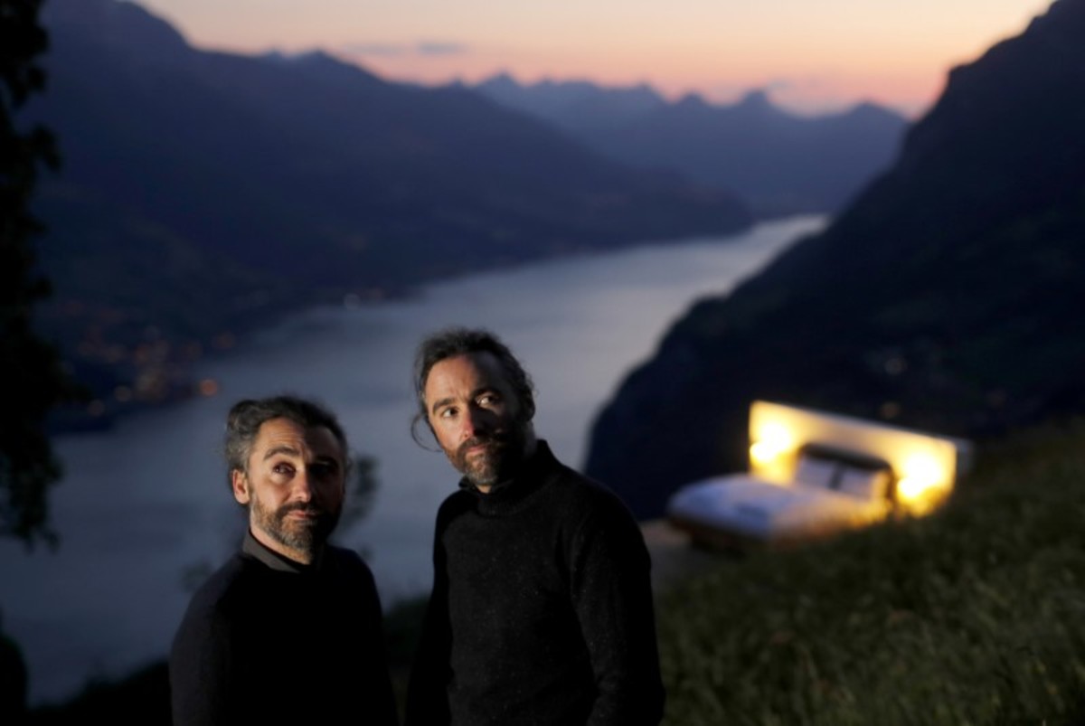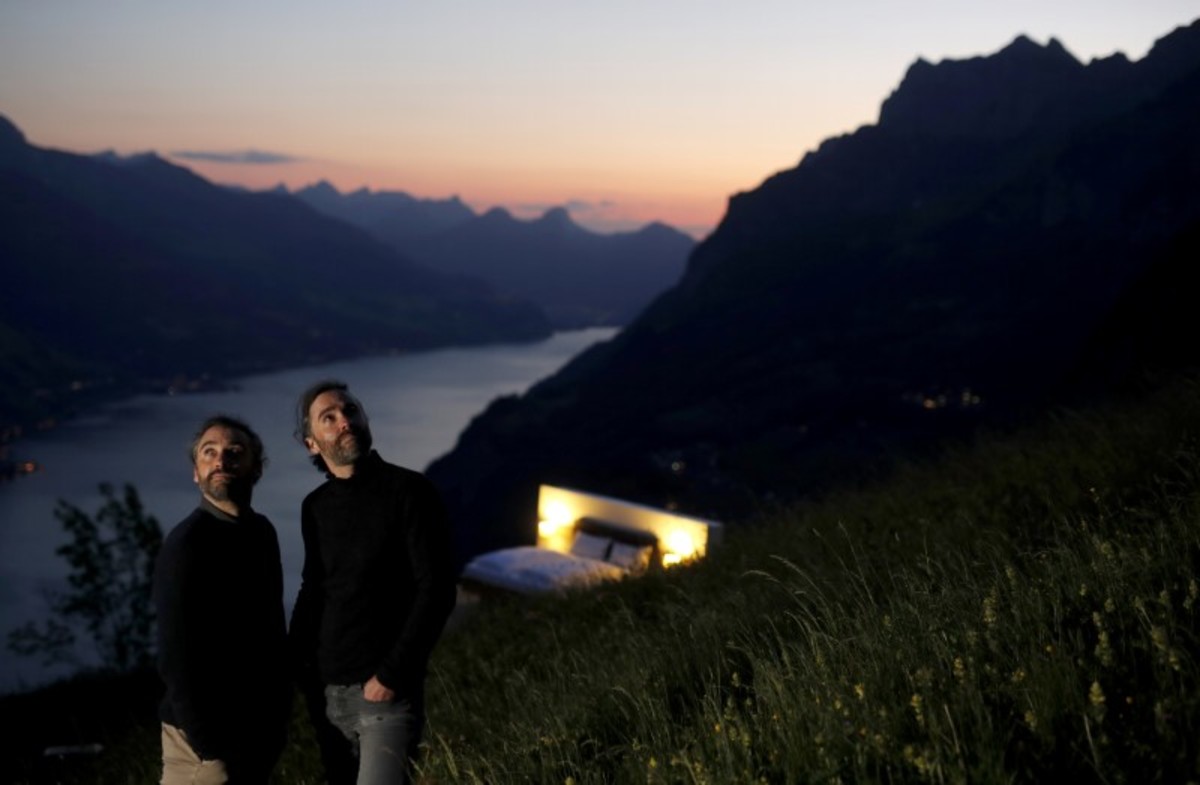 Swiss artists Frank and Patrik Riklin pose in the bedroom of their Zero-Real-Estate land art installation, as the outbreak of the coronavirus disease (COVID-19) continues, on an alp in front of the Churfirsten mountain range and Lake Walen near Walenstadt, Switzerland May 29, 2020. REUTERS/Arnd Wiegmann