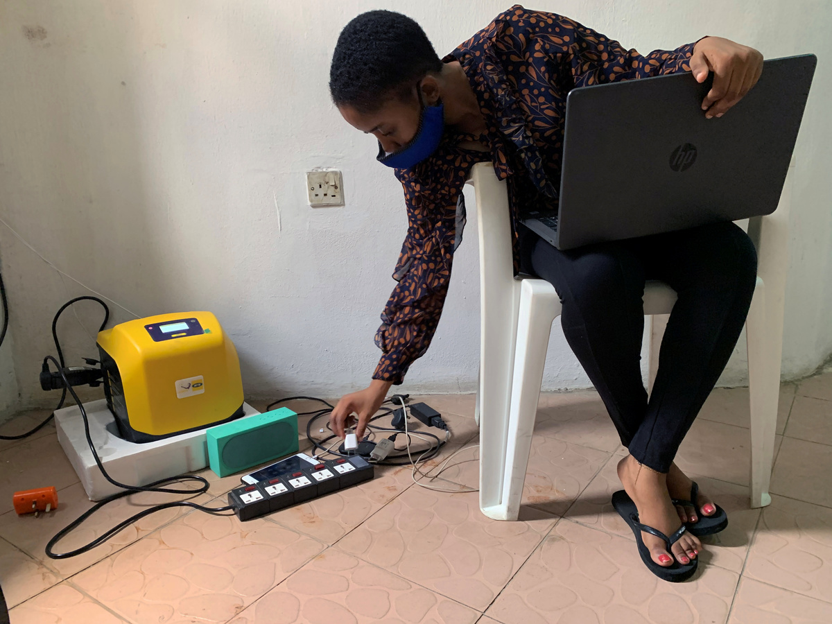 Olowokere found her solution in a yellow box bought by her employer from solar company Lumos. Connected to a panel on her roof, it keeps her phone, laptop and WiFi running through the workday, as well as a music speaker.