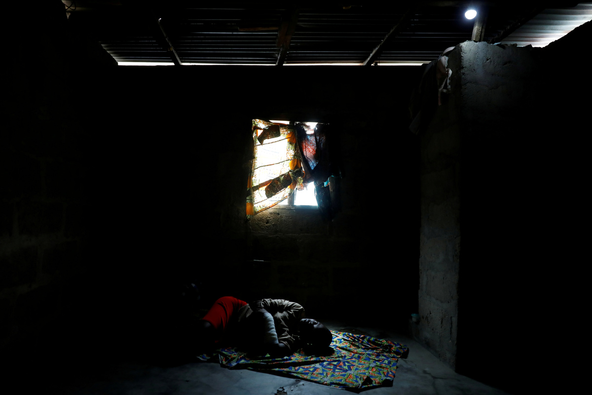 Beneficiary of Salpha Energy solar panel home installation, Recent Kodjo, lies on a wrapper in her room illuminated with a bulb powered by the installed solar energy, in Sagbo-Kodji community, amid concerns over the spread of coronavirus disease (COVID-19) in Lagos, Nigeria April 25, 2020. Picture taken April 25, 2020. REUTERS/Temilade Adelaja