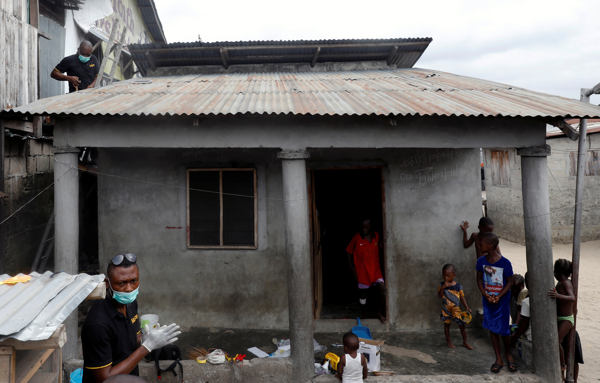 An employee of Salpha Energy installs a solar panel on the roof of one of the homes in Sagbo-Kodji community, amid concerns over the spread of coronavirus disease (COVID-19) in Lagos, Nigeria April 25, 2020. Picture taken April 25, 2020. REUTERS/Temilade Adelaja