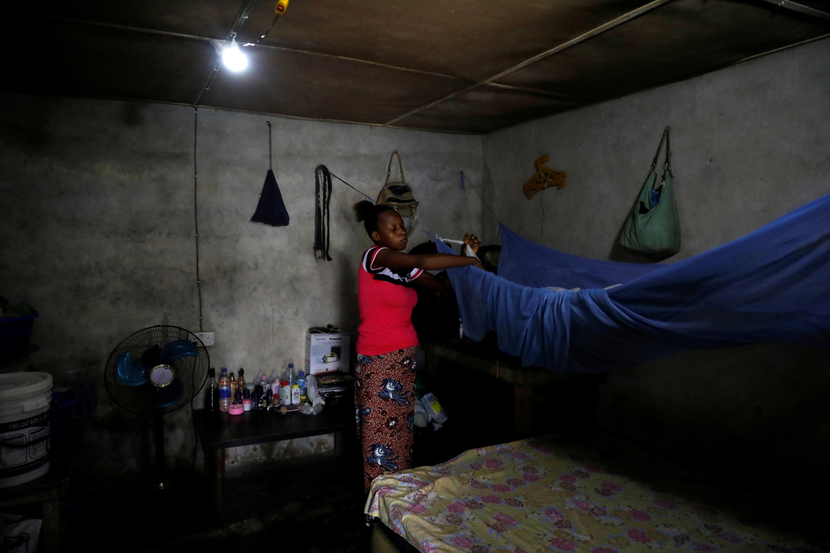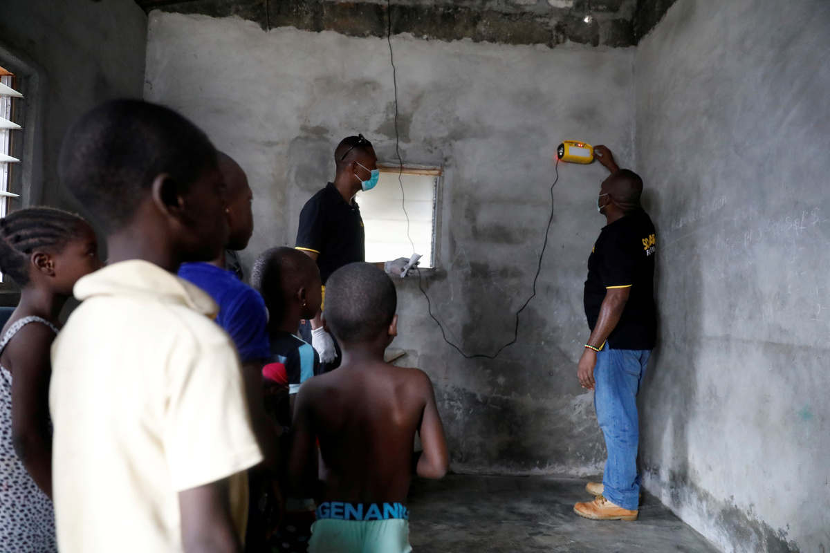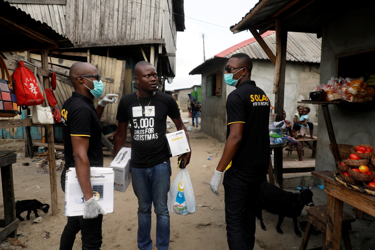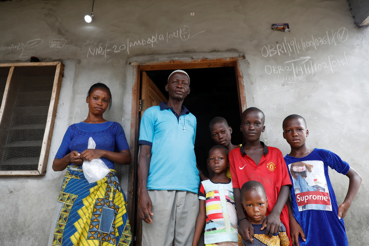 Children watch employees of Salpha Energy installing a music player powered by solar energy in their home at Sagbo-Kodji community, amid concerns over the spread of coronavirus disease (COVID-19) in Lagos, Nigeria April 25, 2020. Picture taken April 25, 2020. REUTERS/Temilade AdelajaPhilomena Yanuve, one of the beneficiaries of Salpha Energy solar panel home installation, adjusts her mosquito net in her room illuminated with a bulb powered by the installed solar energy, in Sagbo-Kodji community, amid concerns over the spread of coronavirus disease (COVID-19) in Lagos, Nigeria April 25, 2020. Picture taken April 25, 2020. REUTERS/Temilade AdelajaEmployees of Salpha Energy discuss as they arrive to Sagbo-Kodji community to install solar panels in some homes, amid concerns over the spread of coronavirus disease (COVID-19) in Lagos, Nigeria April 25, 2020. Picture taken April 25, 2020. REUTERS/Temilade AdelajaBeneficiary of Salpha Energy solar panel home installation, Peter Balogun and his family, pose for a picture in front of their home illuminated with a bulb powered by the installed solar energy, in Sagbo-Kodji community, amid concerns over the spread of coronavirus disease (COVID-19) in Lagos, Nigeria April 25, 2020. Picture taken April 25, 2020. REUTERS/Temilade Adelaja