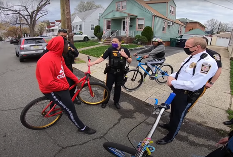 A video that has now gone viral shows a group of about 15 or 20 teenagers riding their bicycles through Perth Amboy, New Jersey, when some police cars start following them. The teens then pull over, and a policeman in a white shirt steps out.