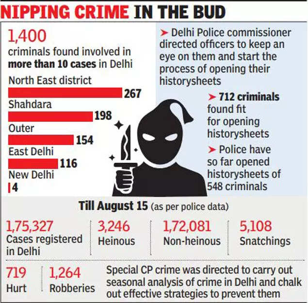 The officers have been asked to make over 1,400 criminals involved in 10 cases or more history-sheeters. Data shows that 267 such criminals were identified by Northeast district, whereas 198 criminals were found in Shahdara, 154 in Outer and 136 in East district.