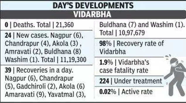 The day’s tally stood at 24 cases, 39 recoveries and 10,604 tests. No Covid death has taken place so far across the 11 districts of Vidarbha in September. The region still has 224 patients under treatment, which is 0.02% of the caseload.
