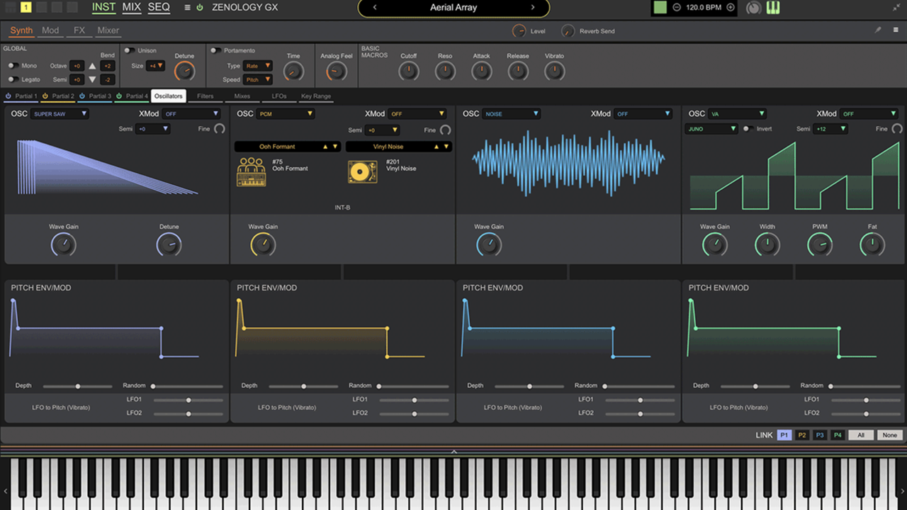 Zenology GX’s synth architecture stacks four layers of virtual analogue or PCM waveforms in each patch; nine VA waveforms are on offer alongside supersaw, noise and an extensive library of 7000 PCM waves. These are joined by ten modelled filter types, including a Jupiter-8 emulation, and modulation duties are augmented by 11 available LFO shapes, including a tempo-synced Step LFO with up to 37 curves per step.