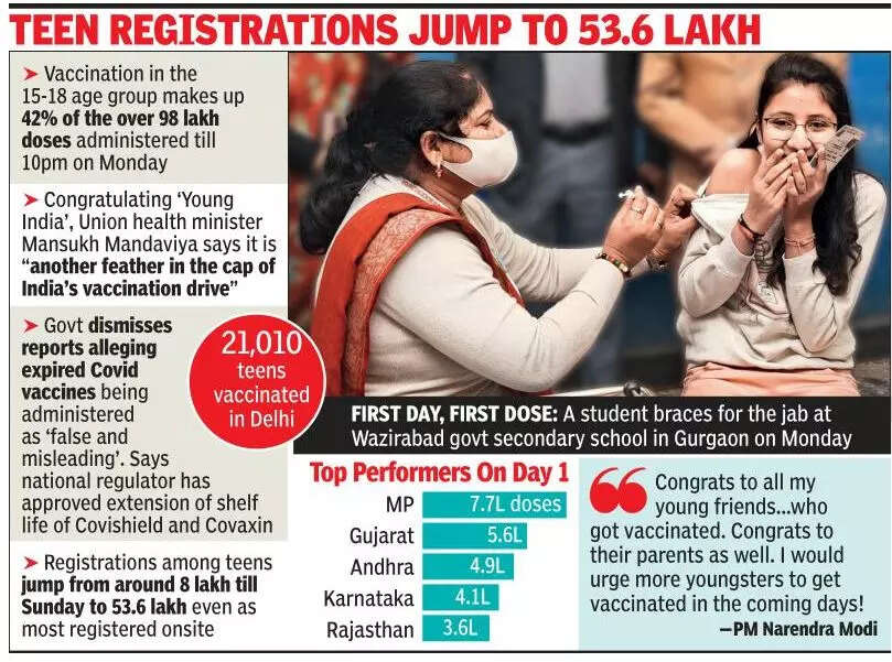 NEW DELHI: The launch of Covid vaccination for adolescents drew an enthusiastic response, with nearly 41.3 lakh youngsters between 15 and 18 years of age receiving jabs till 11pm on Monday, boosting the daily vaccination tally to 98.6 lakh, just under a crore.