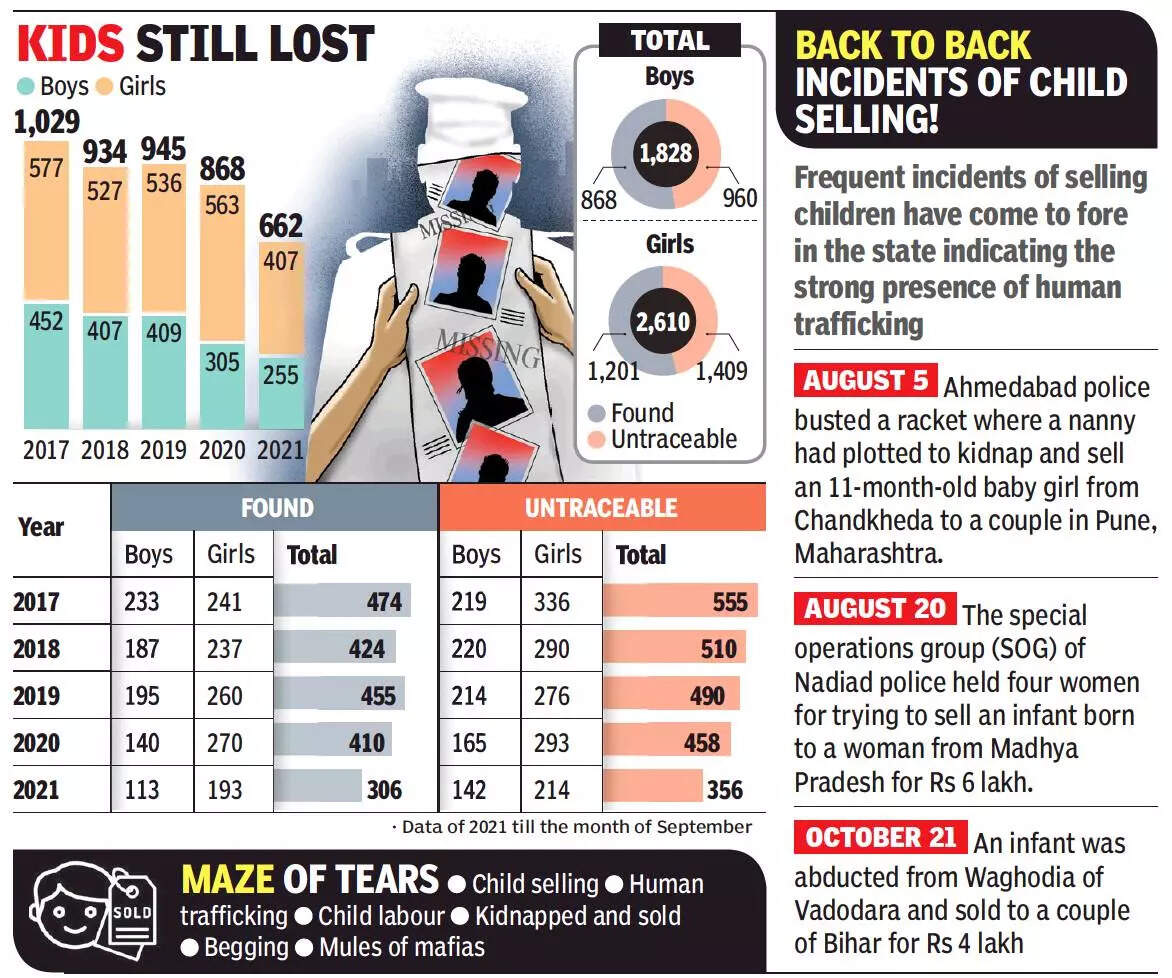 AHMEDABAD: The reports of selling and lifting of infants from various parts of the state and the scare of children snatching give a disturbing picture of the society as a whole, but it also depicts the irresponsible approach of the state with the alarming data of missing kids aged up to 14 years suggesting that half of the missing children have never returned.