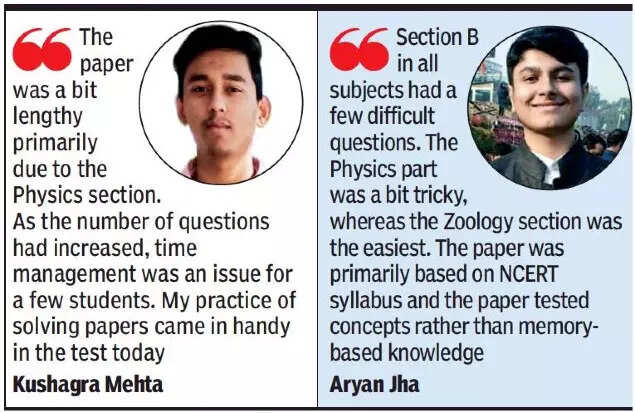 The paper level was moderate, said students, with easy chemistry and concept-based botany sections. The physics section focused primarily on direct formulas, they added. “Overall, the cut-off is expected to be high, given the level of the paper,” said Navya Shukla, a student.