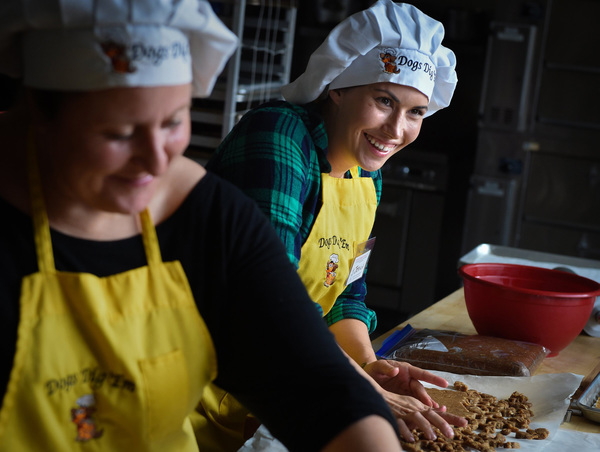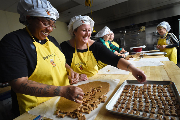 FRESNO, Calif. _ Wearing white floppy chef hats and sunny yellow aprons, a group of women chat happily as they mix and roll dough on its journey to becoming all-natural dog biscuits last month. Morning light pours through large wide windows, brightening an already optimistic mood.