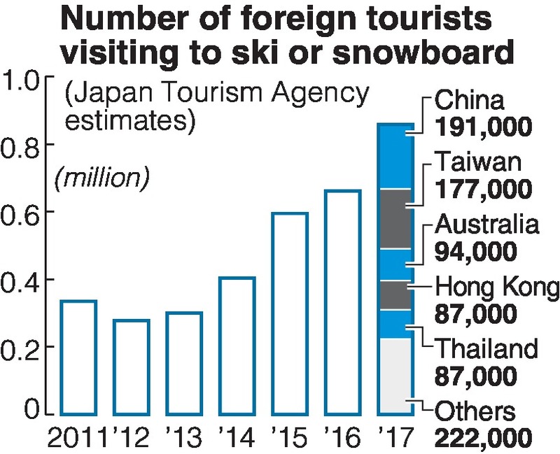 The number of foreign tourists who visit Japan to ski or snowboard has more than tripled since 2012, increasing from about 277,000 to about 858,000 in 2017, according to agency estimates.