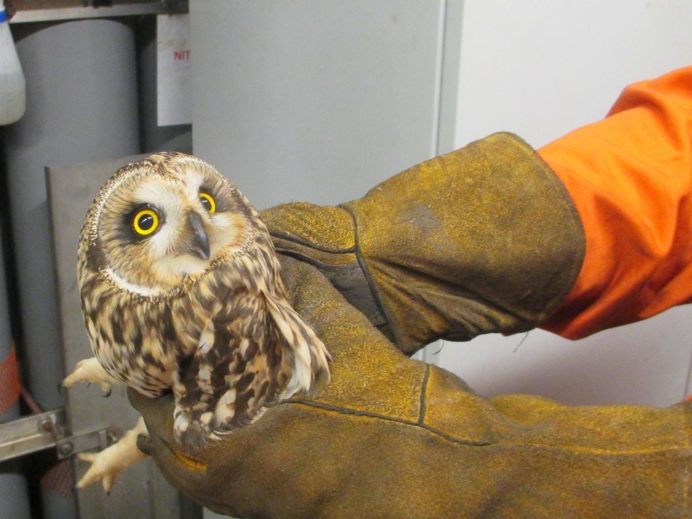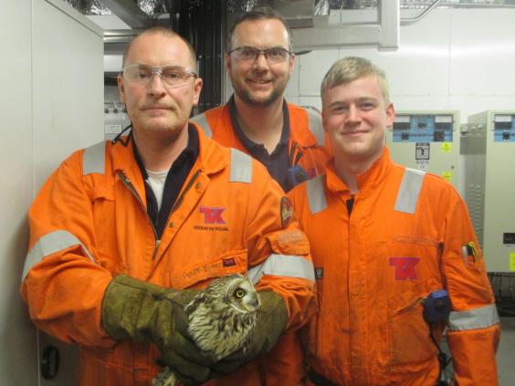 The exhausted short eared owl was discovered on Wednesday and flown by helicopter to Aberdeen with a crew who were due to go back to the mainland.