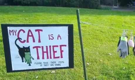 A cat owner has posted a sign asking neighbours to reclaim items stolen by her thieving pet.
