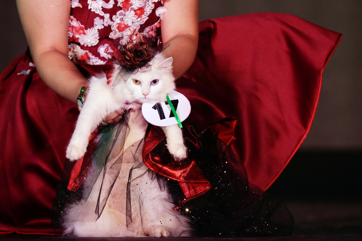 A cat dressed with a gown is carried by its owner during a pet fashion show celebrating World Animals Day in Quezon City, Metro Manila, Philippines, October 6, 2019. REUTERS/Eloisa Lopez