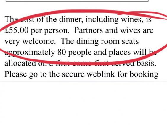 Oxford University has come under fire after a department invited alumni to a dinner, with the invitation stating “partners and wives” were welcome.