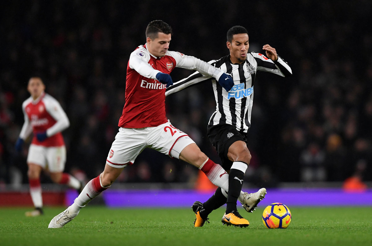 Soccer Football - Premier League - Arsenal vs Newcastle United - Emirates Stadium, London, Britain - December 16, 2017 Arsenal's Granit Xhaka in action with Newcastle United's Ayoze Perez Action Images via Reuters/Tony O'Brien