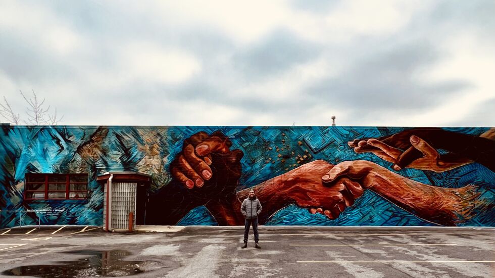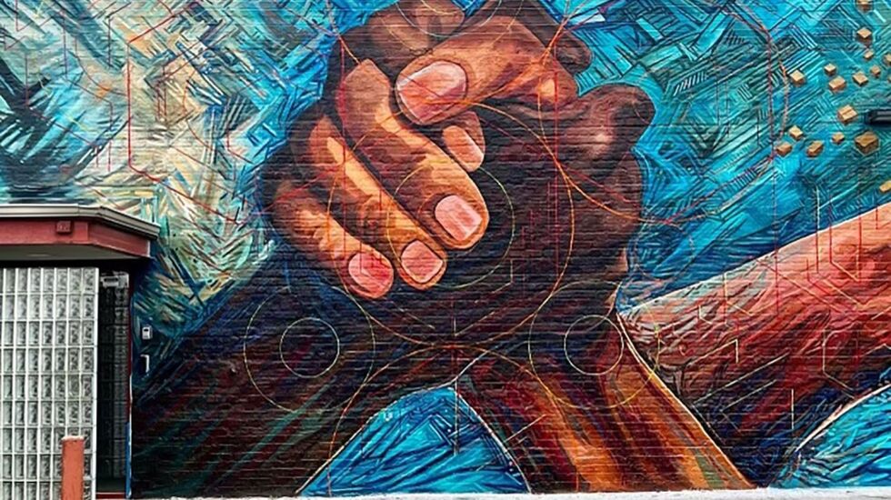 The main features of the mural, which covers a 100-feet-wide span, are three sets of hands. Each, Serrano says, is meant to represent a different type of human interaction.