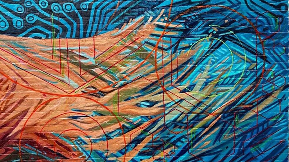 The brushstrokes are carried through into the background of the mural, which combines natural imagery with things that people have created — meant to represent the physical and digital realms of society.