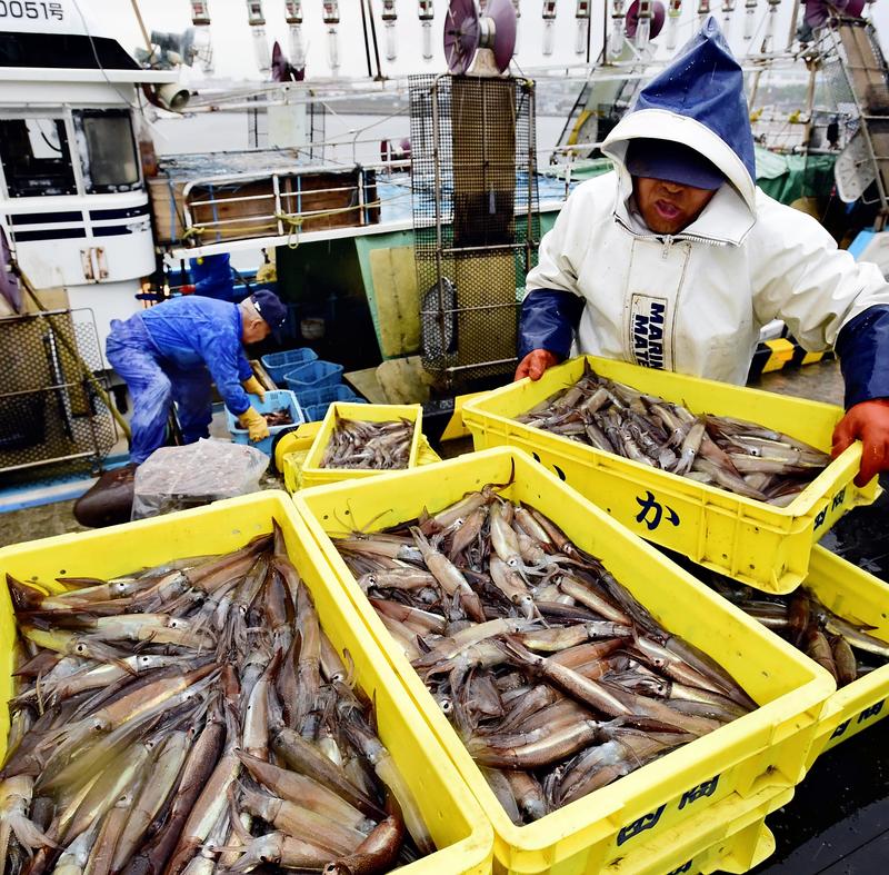 Pacific flying squid season has opened in the waters off Hokkaido's southern coast, and the first catches of the squid were landed on Tuesday at Hakodate Port in Hakodate, Hokkaido. The contract price of the squid has dropped, due to a decrease in tourists because of the spread of the coronavirus. The price of about 2,200 yen per kilogram was less than half last year's level of about 5,200 yen.