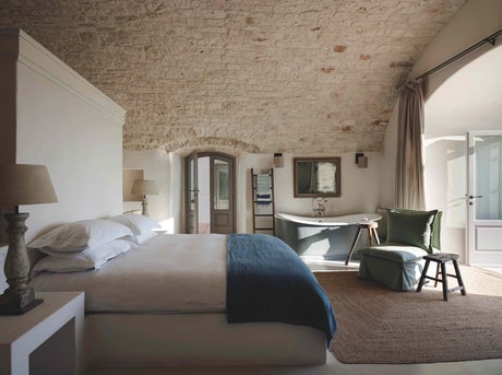 In many cases, the exposure of natural stone walls and features warrants the abandonment of artwork, in the traditional sense, altogether. In a recent project in Puglia by London-based interior design studio, Alexander Waterworth, the natural stone walls of a 300-year-old farmhouse are left to speak for themselves to exquisite effect. “The building has a long history,” he tells me. “It was once a farmhouse, fortified against Saracen invaders, so our goal was to honour the heritage of the building in many aspects of the design. We exposed and regenerated the natural finishes of the project and the building has a richness of history throughout. Maintaining the history of the building was a key factor to the design’s authenticity.” The property has high, vaulted ceilings and original stone fireplaces that Waterworth believes evoke “a rustic purity to refresh the mind.”