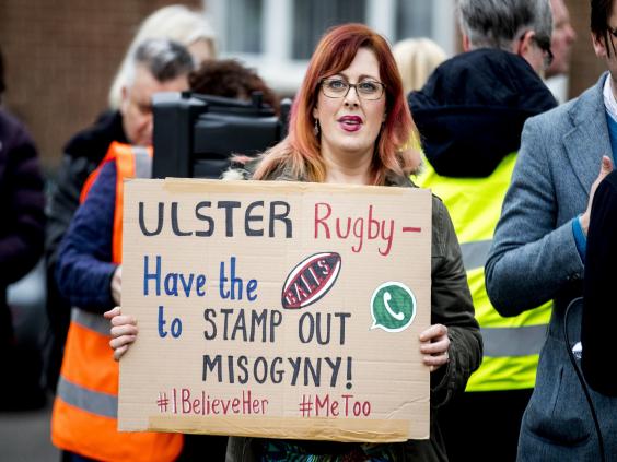 The rally was organised by the Belfast Feminist Network, who claimed the accused “expressed attitudes that are harmful and dangerous” and called for a commitment from rugby leaders to “take action to stamp out misogyny”.