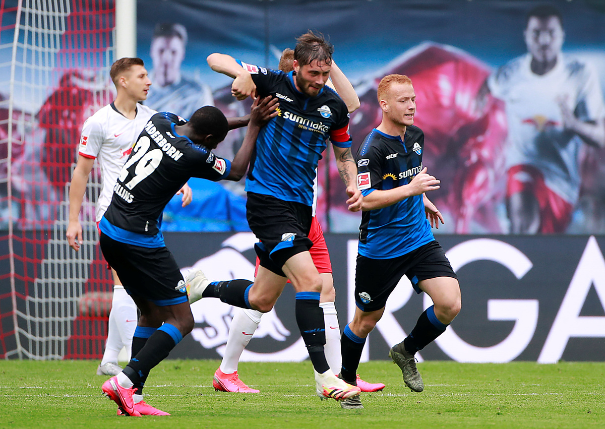 Soccer Football - Bundesliga - RB Leipzig v SC Paderborn - Red Bull Arena, Leipzig, Germany - June 6, 2020 SC Paderborn's Christian Strohdiek celebrates scoring their first goal with teammates, as play resumes behind closed doors following the outbreak of the coronavirus disease (COVID-19) REUTERS/Hannibal Hanschke/Pool