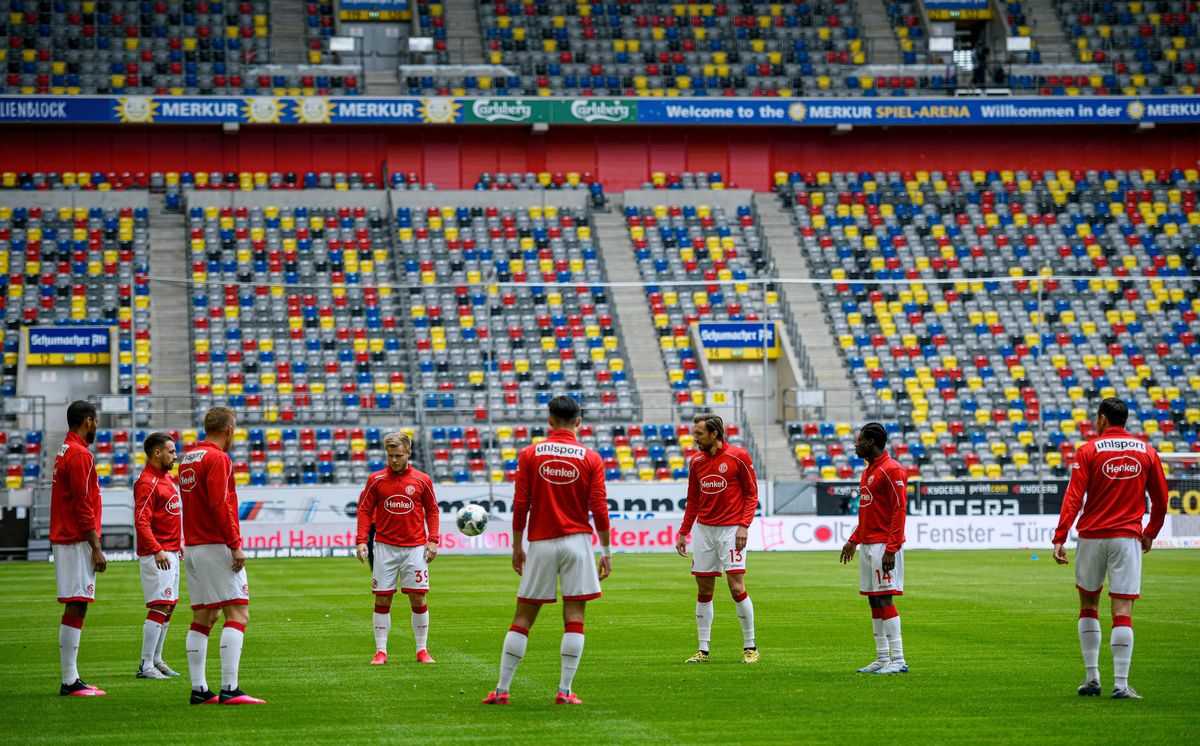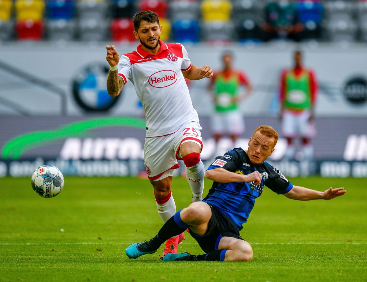 Soccer Football - Bundesliga - Fortuna Dusseldorf v SC Paderborn - Merkur Spiel-Arena, Dusseldorf, Germany - May 16, 2020 Fortuna Dusseldorf's Matthias Zimmermann in action with Paderborn's Sebastian Vasiliadis, as play resumes behind closed doors following the outbreak of the coronavirus disease (COVID-19) Sascha Schuermann/Pool via REUTERSSoccer Football - Bundesliga - Fortuna Dusseldorf v SC Paderborn - Merkur Spiel-Arena, Dusseldorf, Germany - May 16, 2020 Fortuna Dusseldorf players during the warm up before the match, as play resumes following the outbreak of the coronavirus disease (COVID-19) Sascha Schuermann/Pool via REUTERS