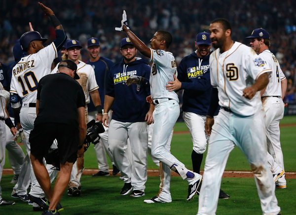 Schimpf answered an inning later with a home run onto the pier and the Padres got two more in the seventh when Myers hit his 19th homer just right of center field.