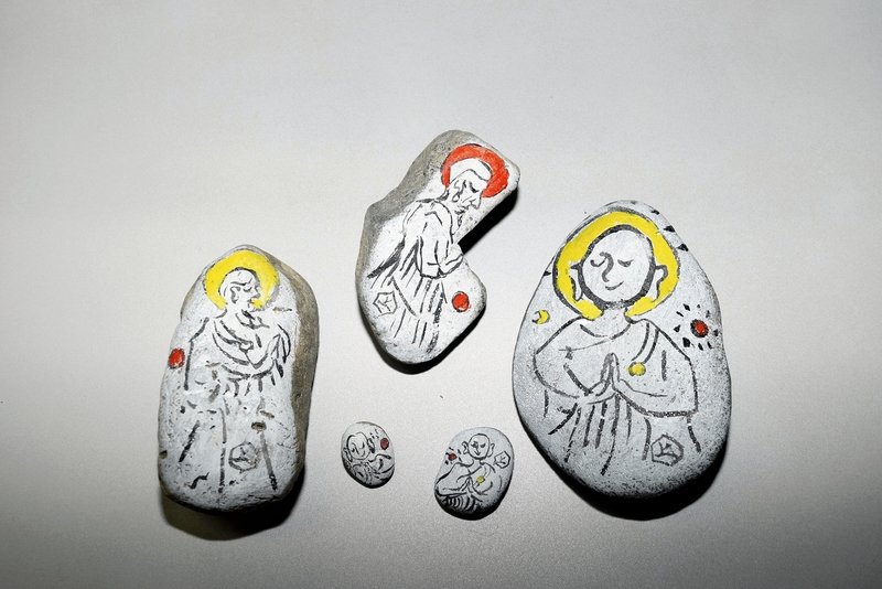 To make stone kannon, Kunimi picks up stones and pebbles from the riverside of the Shimanto River that flows in front of his home. The stones vary in size, from about a 500 yen-coin size to as large as the palm of his hand. After washing them with water and drying them, he puts on white acrylic paint to one side, then a gentle smiling kannon with hands clasped in prayer on top of the paint. Kunimi also made a guidepost for Kosanji temple by carving the kanji characters for the temple into a stone.