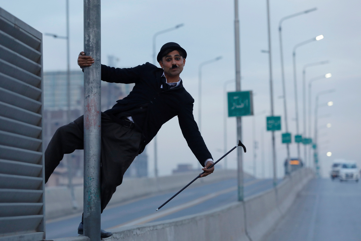 Khan dons the familiar costume of Chaplin's "The Tramp" character, with fake moustache and a little eyeliner. He takes to the streets, often accompanied by friends filming him, hoping to bring a bit of cheer in dreary times.