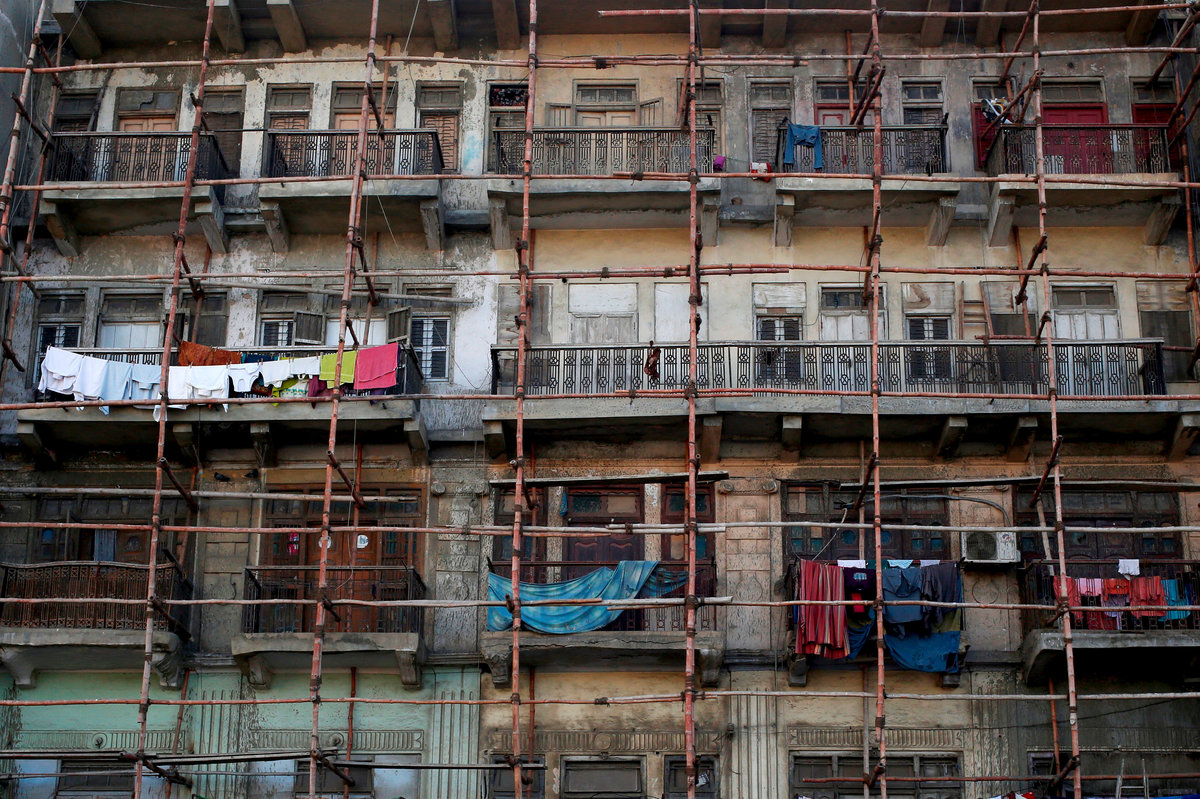 Bamboo scaffolding is fixed to a building, built in the British colonial period, in Karachi, Pakistan, February 9, 2018. REUTERS/Akhtar Soomro
