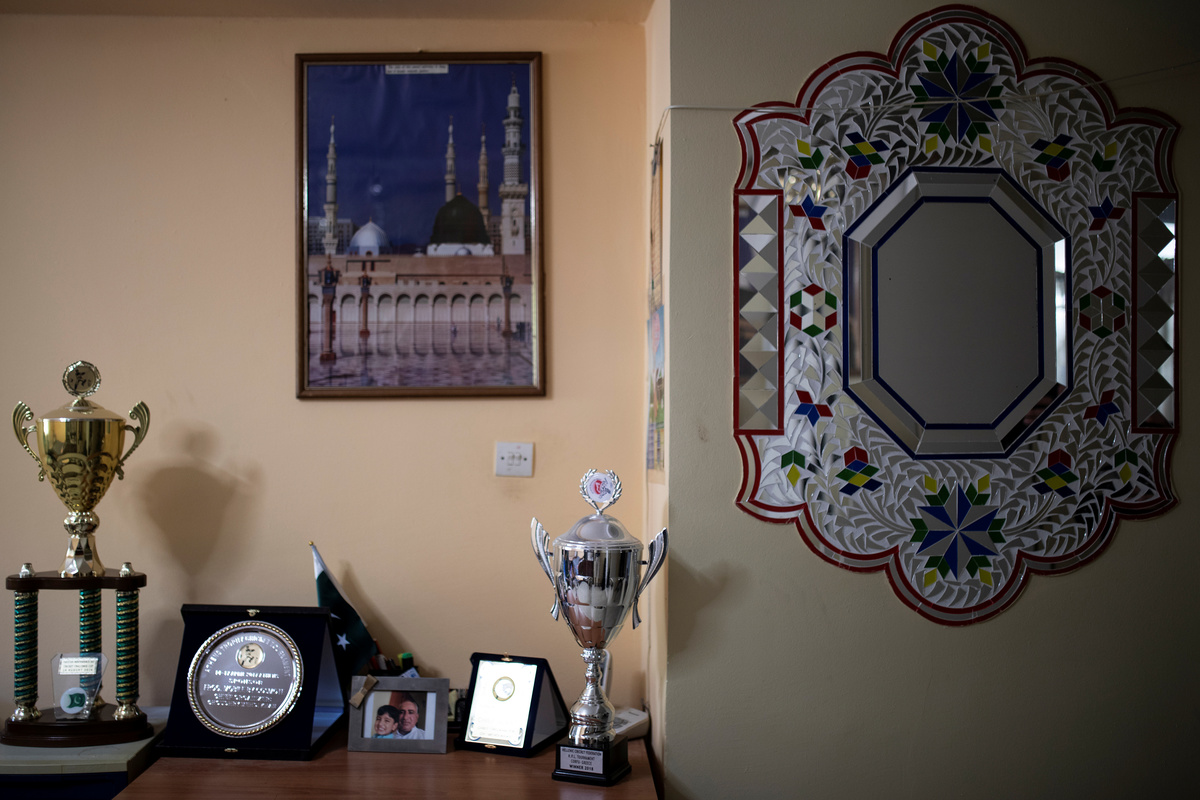 His home is adorned with trophies won over the years. A photograph shows him posing with a large Pakistani flag during a cricket match at the 2004 Athens Olympics.