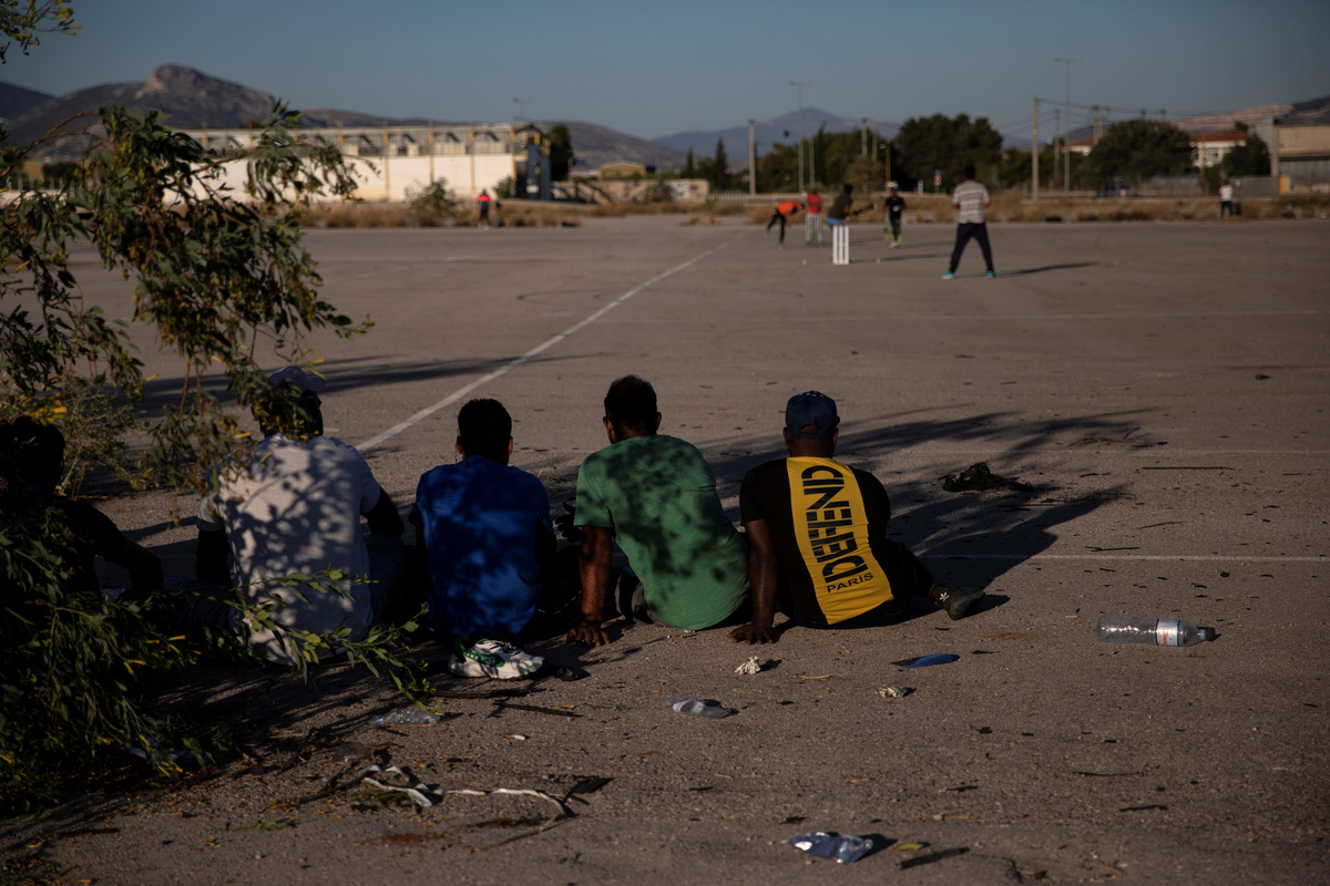 Pakistani men living in Greece watch a game of tape-ball cricket in a disused parking lot for trucks in an industrial area in Elefsina, Greece, June 30, 2019. Picture taken June 30, 2019. REUTERS/Alkis Konstantinidis