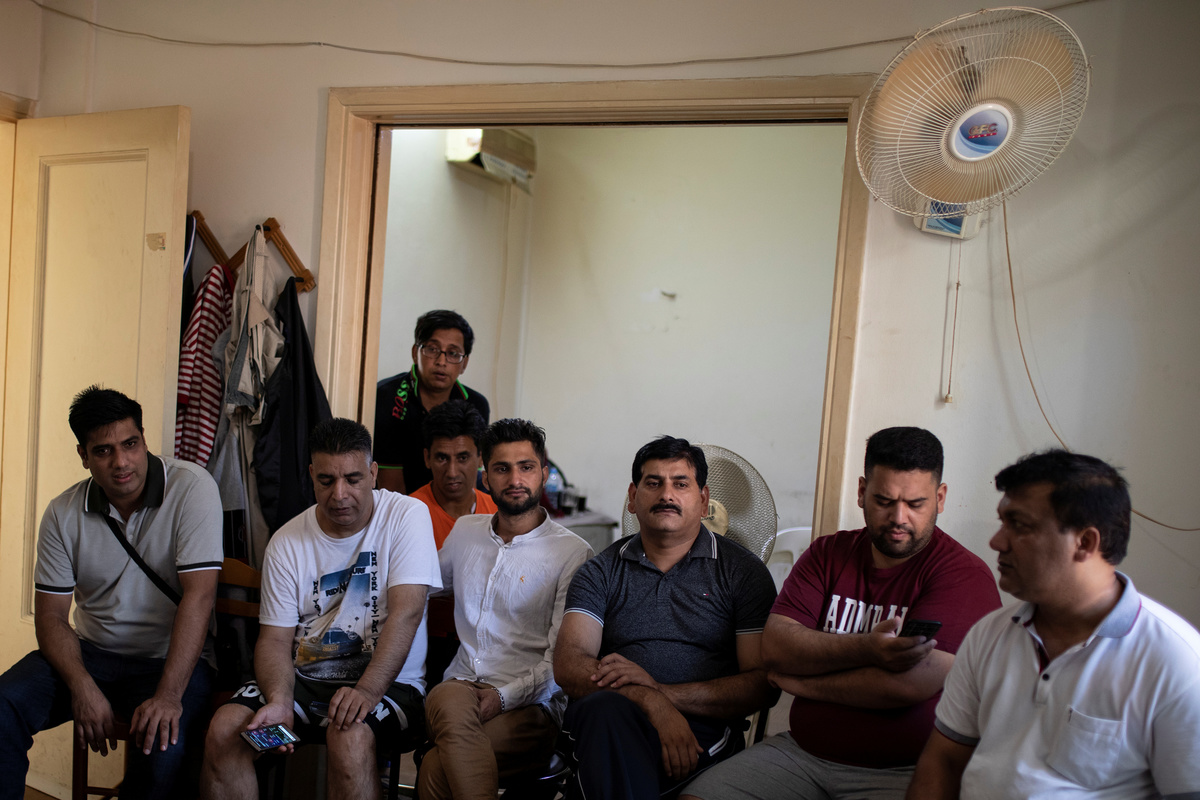 Pakistani street cricketer Awais Mughal, 30, (R) watches his national cricket team's World Cup game against South Africa in an apartment in Athens, Greece, June 23, 2019. Picture taken June 23, 2019. REUTERS/Alkis Konstantinidis