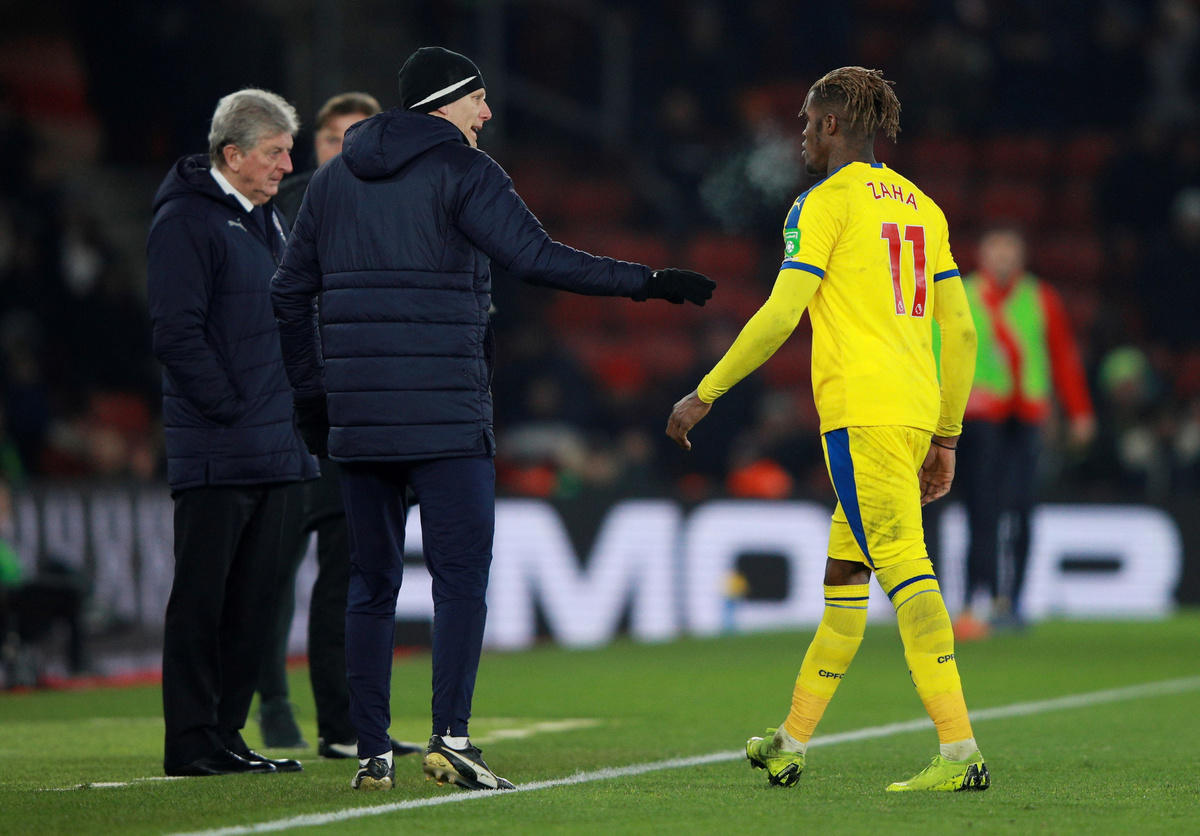 Soccer Football - Premier League - Southampton v Crystal Palace - St Mary's Stadium, Southampton, Britain - January 30, 2019 Crystal Palace's Wilfried Zaha leaves the pitch after he is sent off as Crystal Palace manager Roy Hodgson looks on REUTERS/Ian Walton