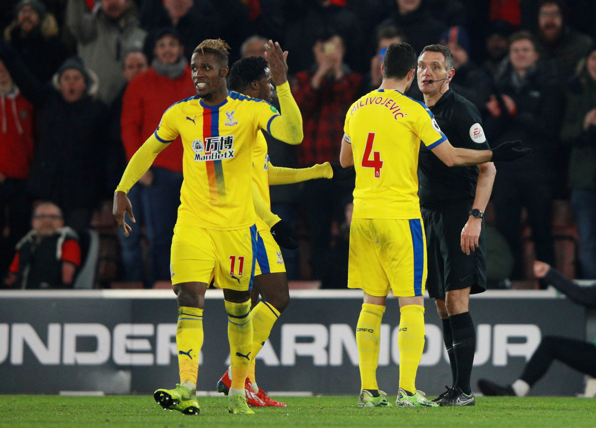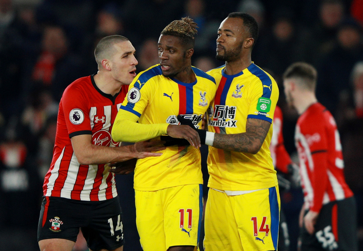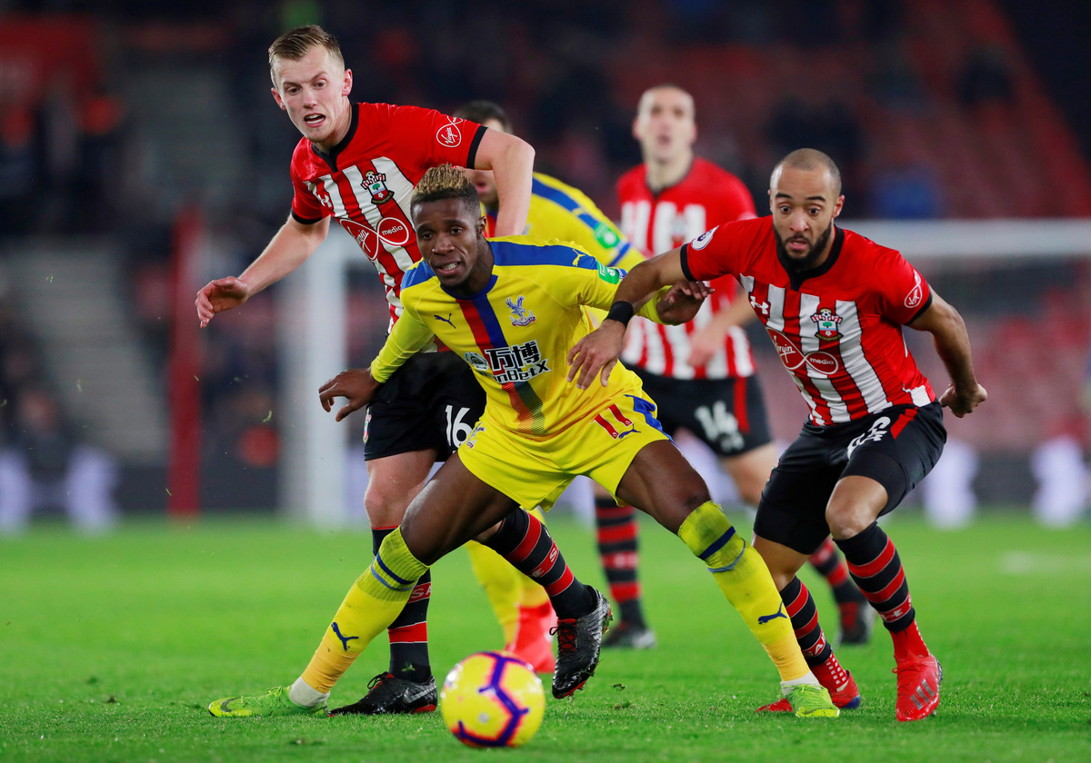 Soccer Football - Premier League - Southampton v Crystal Palace - St Mary's Stadium, Southampton, Britain - January 30, 2019 Crystal Palace's Wilfried Zaha in action with Southampton's James Ward-Prowse and Nathan Redmond Action Images via Reuters/Andrew Couldridge Soccer Football - Premier League - Southampton v Crystal Palace - St Mary's Stadium, Southampton, Britain - January 30, 2019 Crystal Palace's Wilfried Zaha reacts as he is sent off by referee Andre Marriner REUTERS/Ian Walton Soccer Football - Premier League - Southampton v Crystal Palace - St Mary's Stadium, Southampton, Britain - January 30, 2019 Crystal Palace's Wilfried Zaha during the match REUTERS/Ian Walton