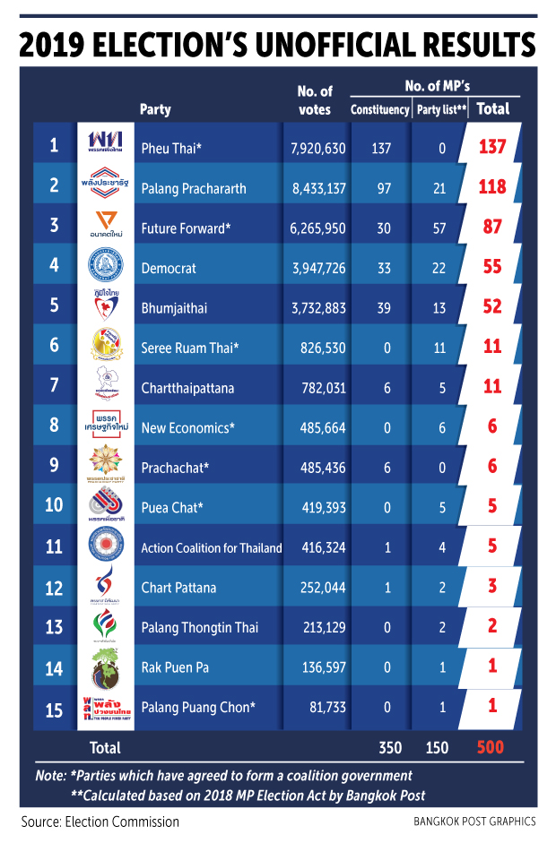 The 10 parties with the most votes are: Palang Pracharath (8.43 million), Pheu Thai (7.92 million), Future Forward (6.26 million), Democrat (3.95 million), Bhumjaithai (3.73 million), Thai Liberal 826,517, Chartthaipattana (782,030), New Economics (485,660), Prachachat (485,436) and Puea Chat (419,388).