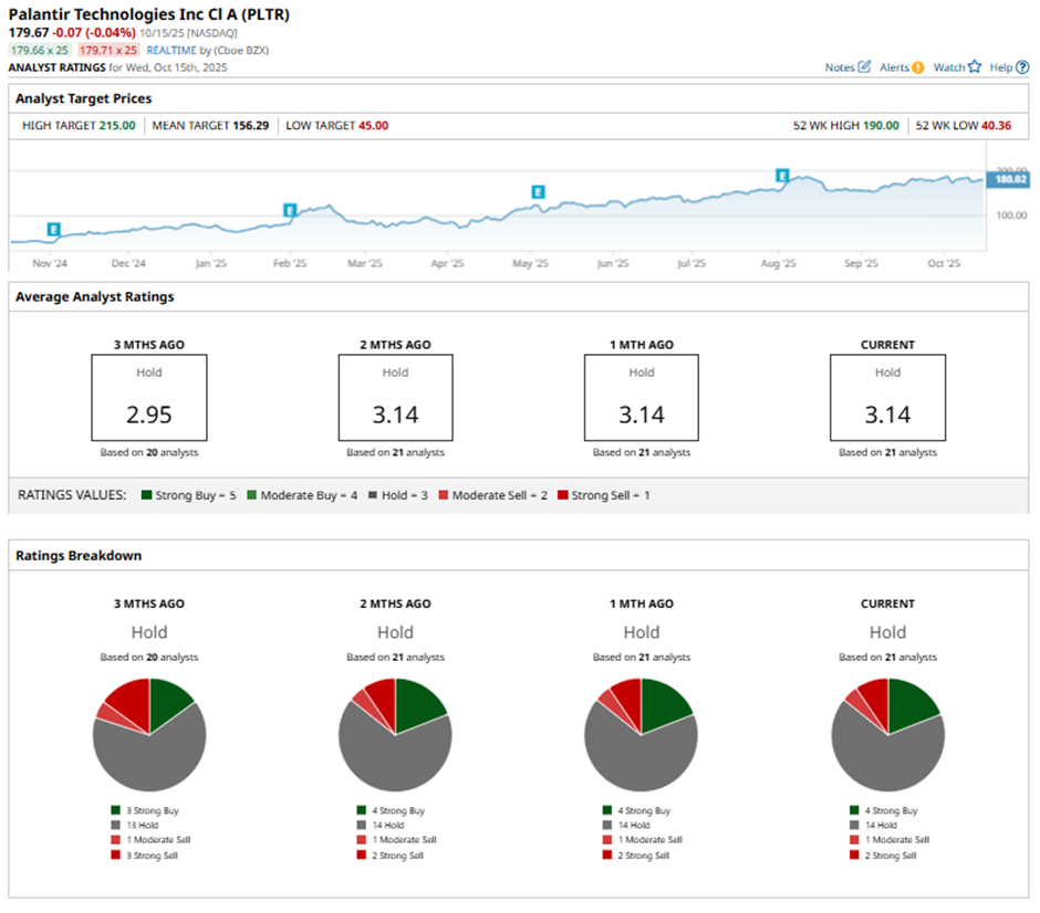 PLTR has a consensus rating of a “Hold” overall. Of the 21 analysts covering the stock, four advise a “Strong Buy,” 14 suggest a “Hold,” one analyst gives it a “Moderate Sell” rating, and two rate it as a “Strong Sell.”
