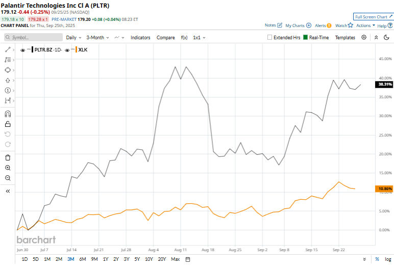 PLTR recorded its 52-week high of $190 on Aug. 12, and is currently trading 5.7% below the peak. The stock surged 25.4% over the past three months, outpacing the Technology Select Sector SPDR Fund’s (XLK) 11.5% returns over the same time frame.