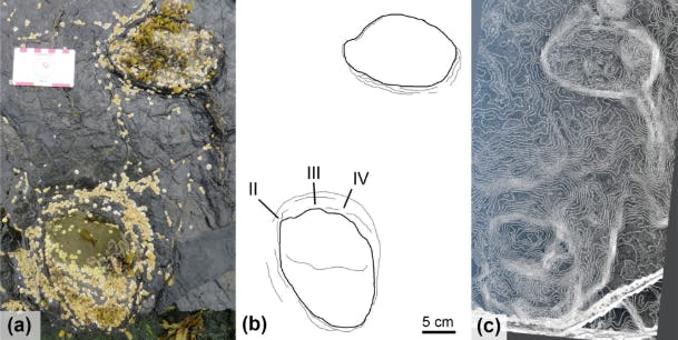 Abstract: Dinosaur fossils from the Middle Jurassic are rare globally, but the Isle of Skye (Scotland, UK) preserves a varied dinosaur record of abundant trace fossils and rare body fossils from this time. Here we describe two new tracksites from Rubha nam Brathairean (Brothers’ Point) near where the first dinosaur footprint in Scotland was found in the 1980s. These sites were formed in subaerially exposed mudstones of the Lealt Shale Formation of the Great Estuarine Group and record a dynamic, subtropical, coastal margin. These tracksites preserve a wide variety of dinosaur track types, including a novel morphotype for Skye: Deltapodus which has a probable stegosaur trackmaker. Additionally, a wide variety of tridactyl tracks shows evidence of multiple theropods of different sizes and possibly hints at the presence of large-bodied ornithopods. Overall, the new tracksites show the dinosaur fauna of Skye is more diverse than previously recognized and give insight into the early evolution of major dinosaur groups whose Middle Jurassic body fossil records are currently sparse