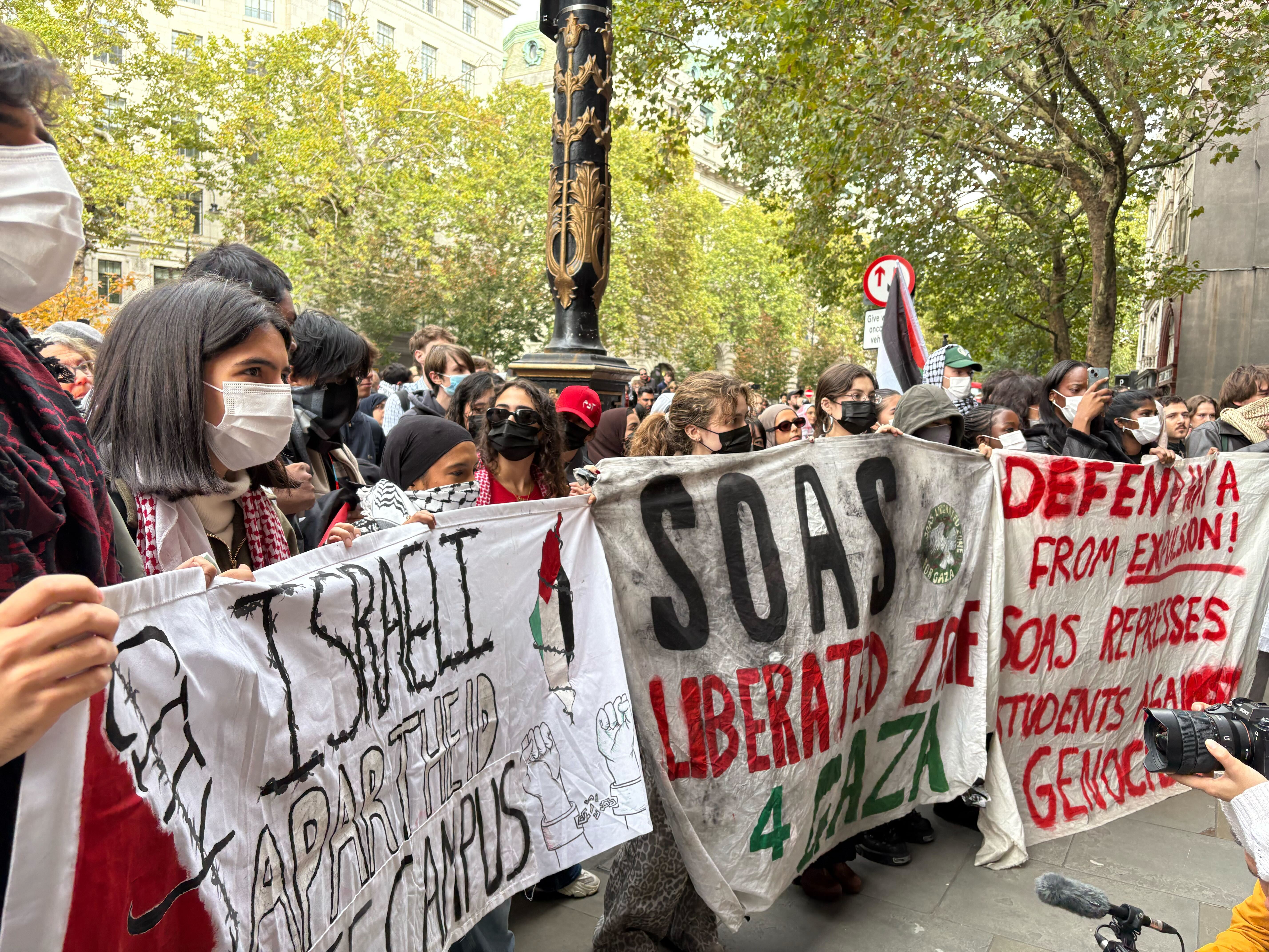 Speaking to more than 100 protesters gathered near SOAS University in Bloomsbury, expelled student Haya Adam said: “Keir Starmer has urged students not to protest today but we are here today.
