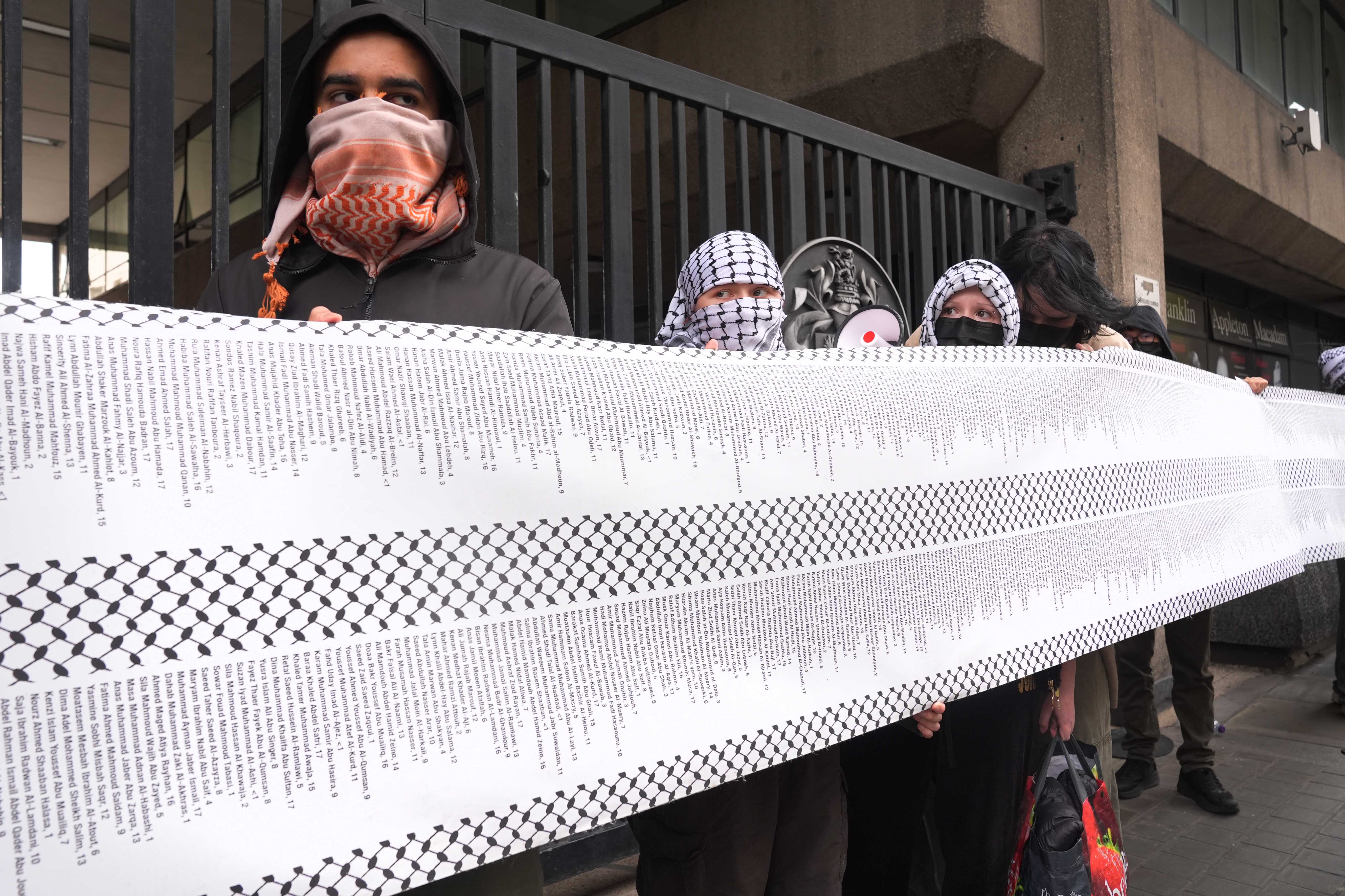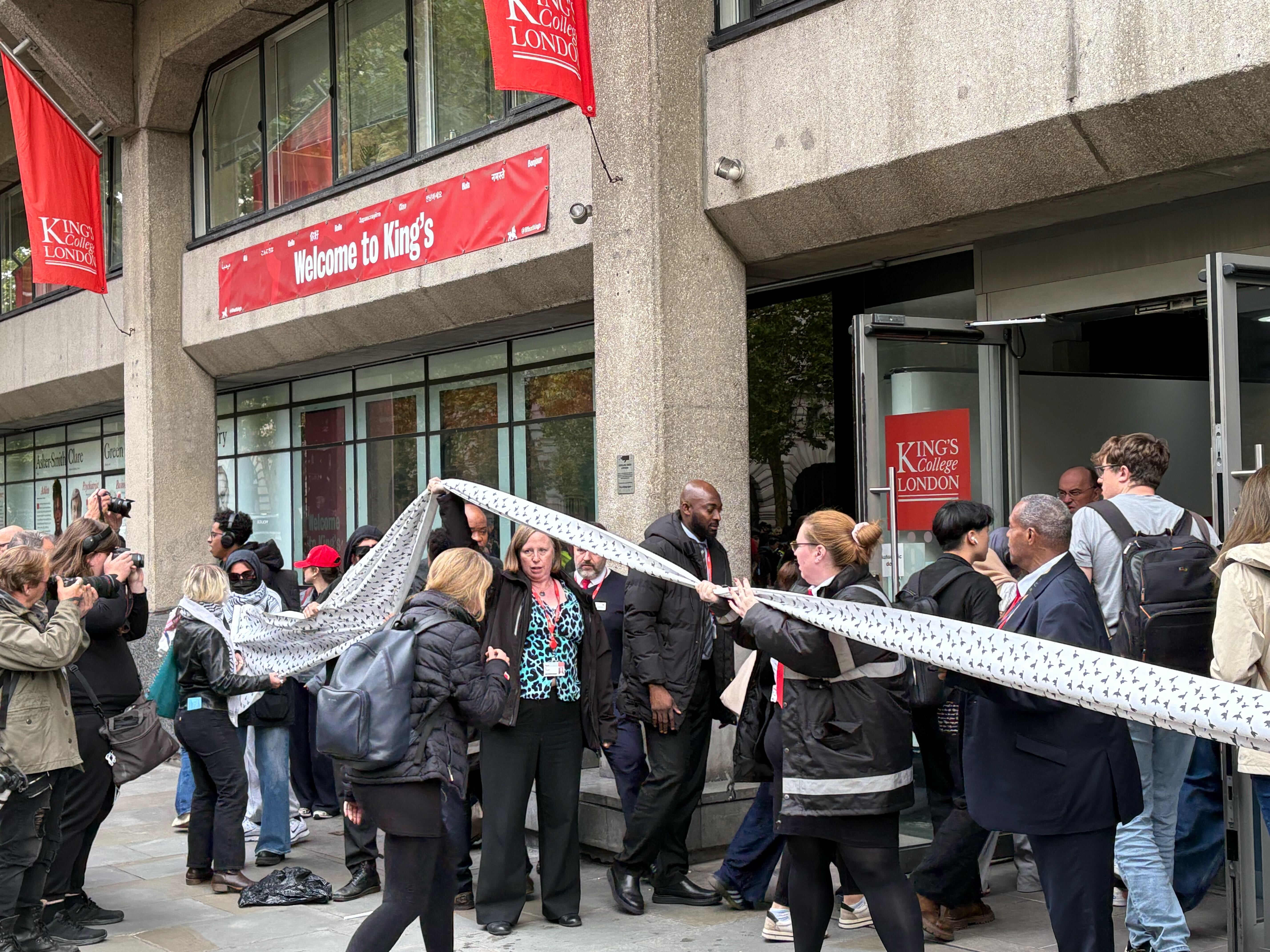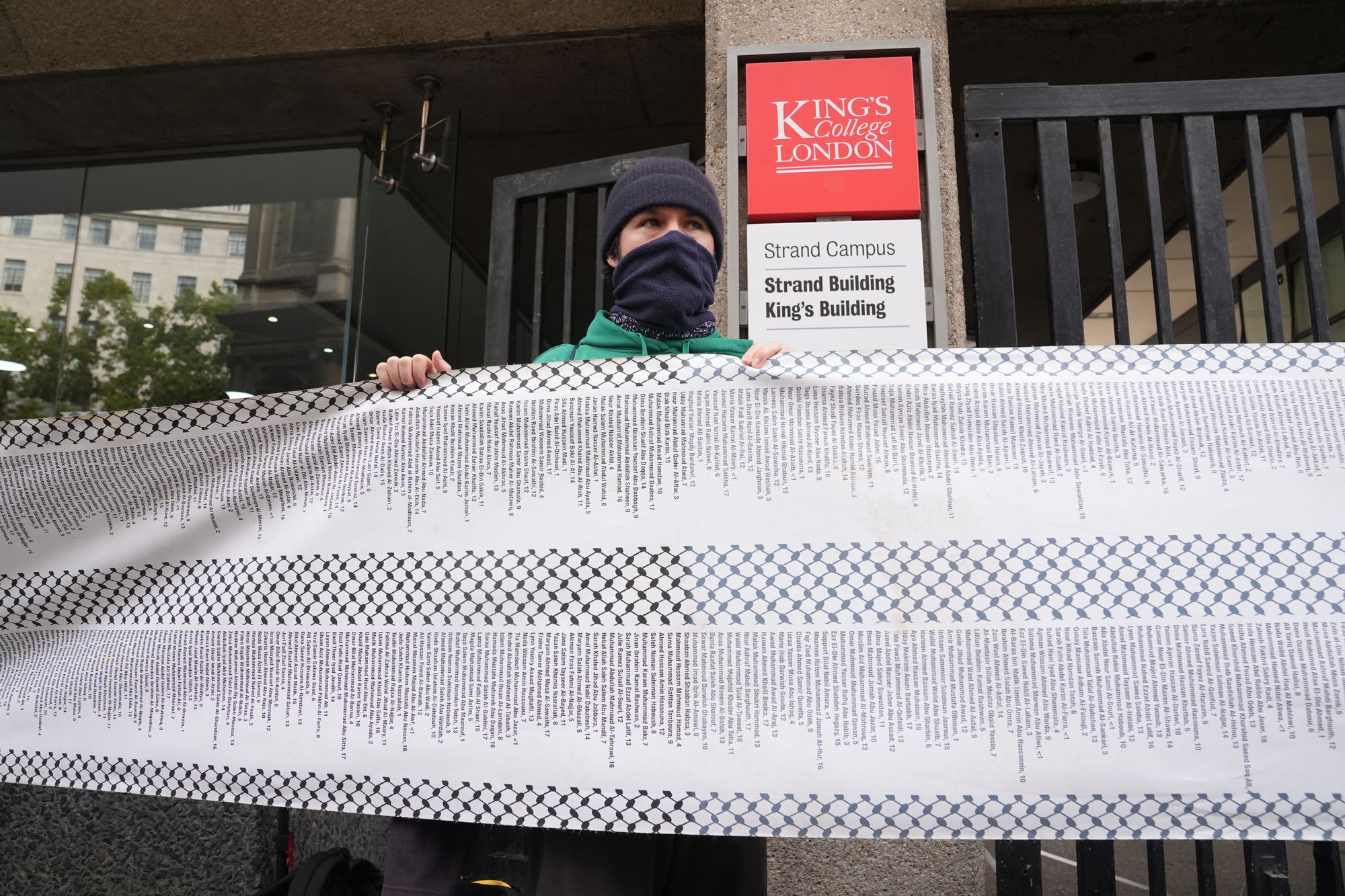Palestine protesters have unfurled a long piece of fabric outside entrance to Strand campus, believed to contain names of those killed in Gaza.