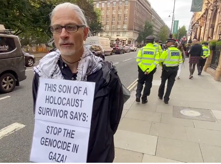 Mr Etkind attended the protest wearing signs reading “this son of a Holocaust survivor says: stop the genocide in Gaza” and “stop arresting Jews for criticising Israel”.